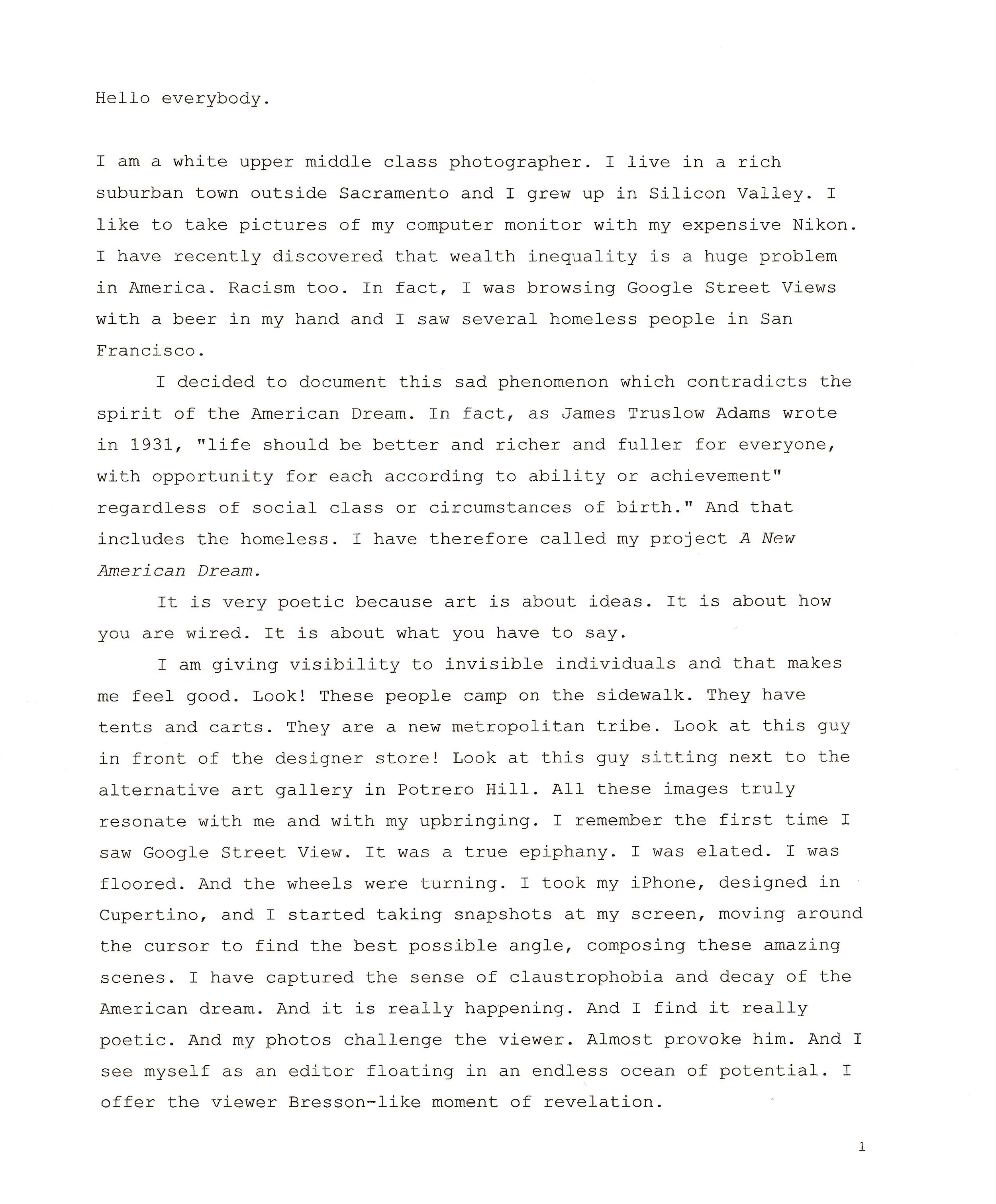A New American Dream consists of hundres of digital photographs of San Francisco streets, sourced from Google Street View and subsequently cropped and edited by COLL.EO.
