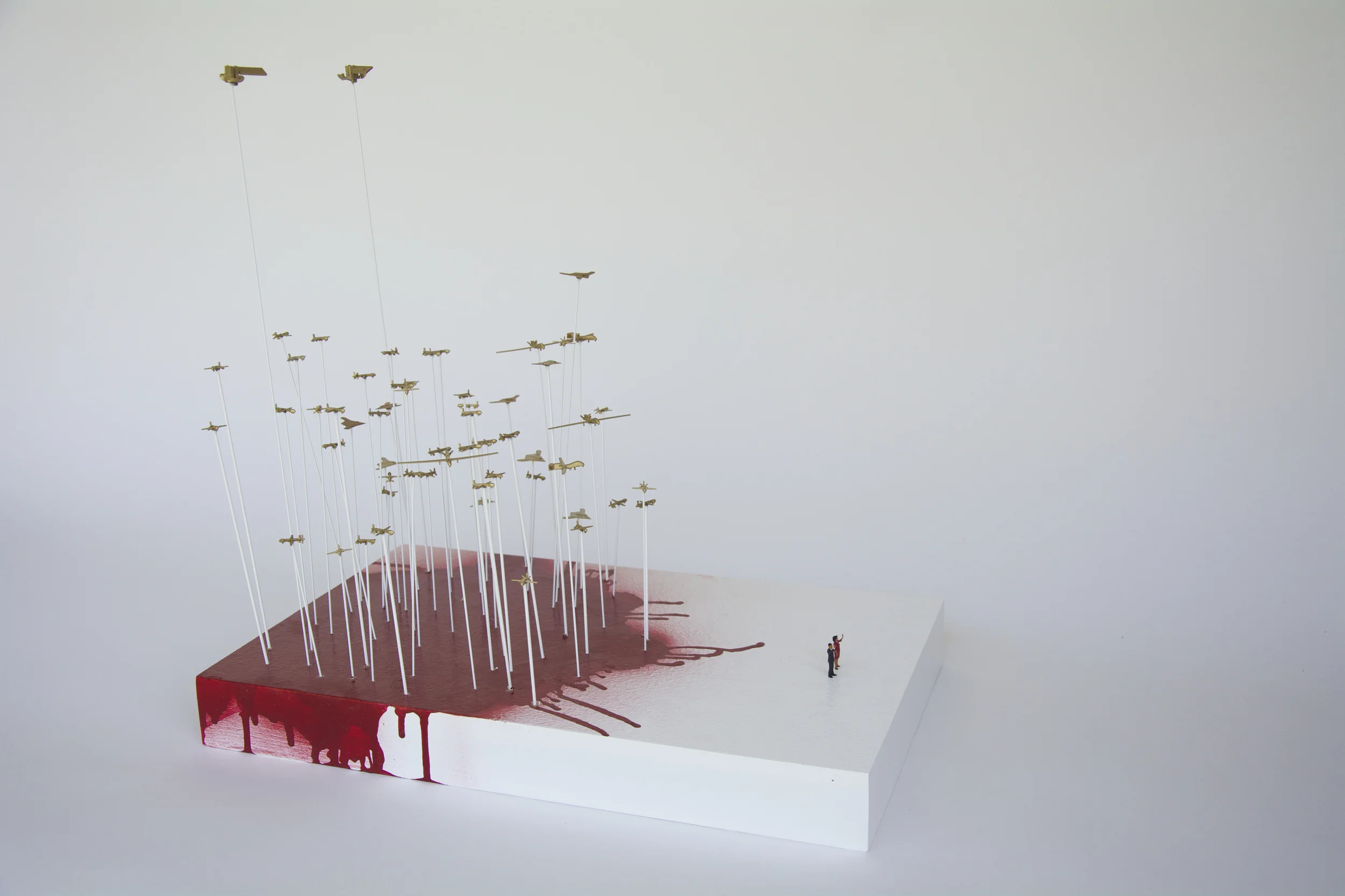 It consists of one layout featuring President Barack Obama and Michelle Obama’s miniatures, several 3D printed drones and satellites in resin (RQ-9 Reaper, RQ-1 Predator, X-47B Pegasus, USA-214 Satellites), wood, metallic sticks, paint, and glue. The layout's size is 14 x 10 x 8 inches (L x H x W).
