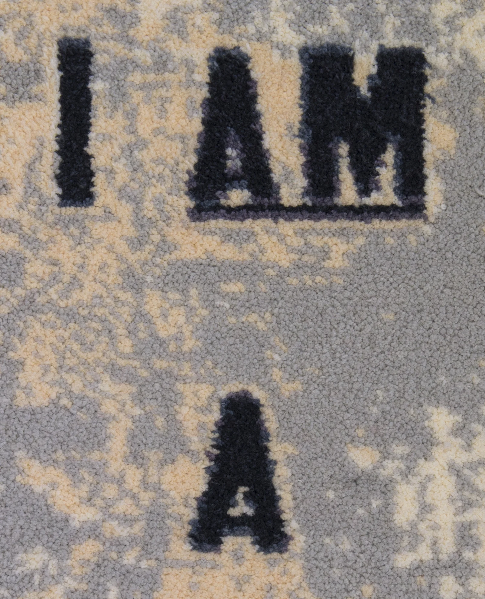 It's titled Status Update and its consists of three wool rugs, latch hook canvas, and cotton.
