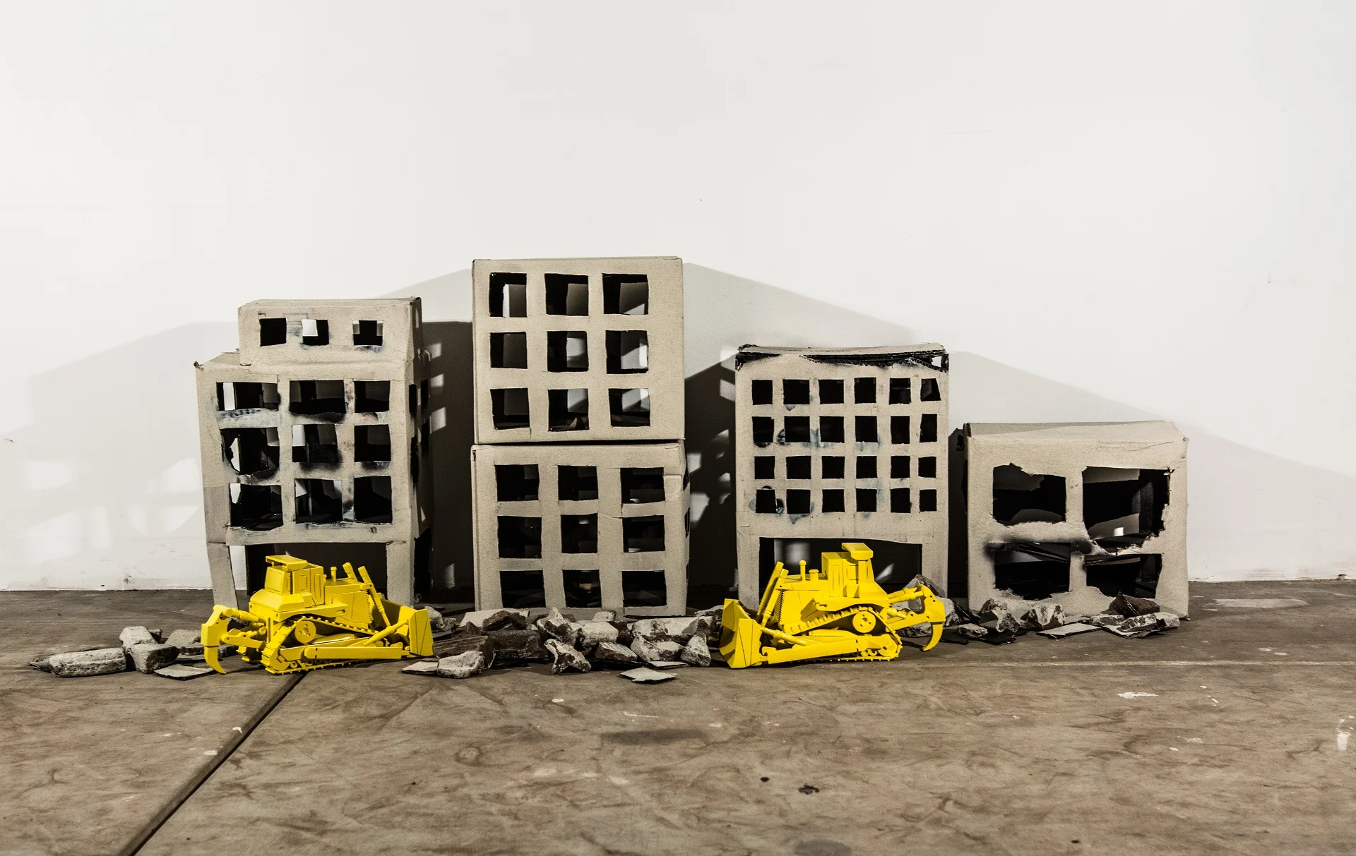 Today we are releasing our new body of work, Gaza Strip Destruction Kit. This installation consists of two D9 wooden bulldozer replicas, Ralph Lauren (™) paint, cardboard, and concrete. It looks like this: