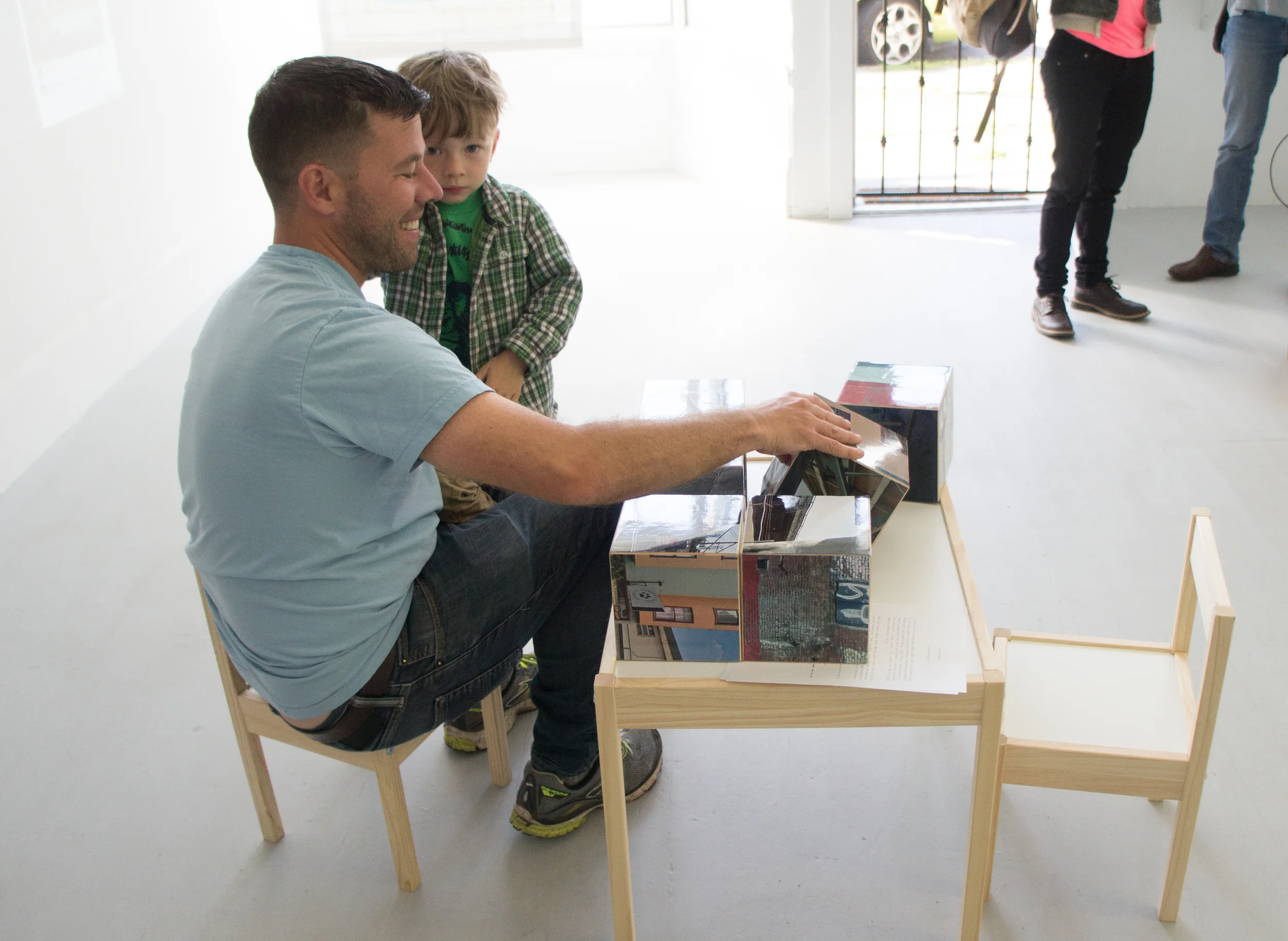 COLL.EO’s City Blocks, six wooden blocks with images measuring 6 x 6 x 6 inches, arranged on an IKEA’s LÄTT children wooden table and two wooden chairs. Table size: 24 ¾ (L) x 18 ⅞ (W) x 17 ¾ (H). Chair size: 11 (L) x 11 (D) x 11 (H).