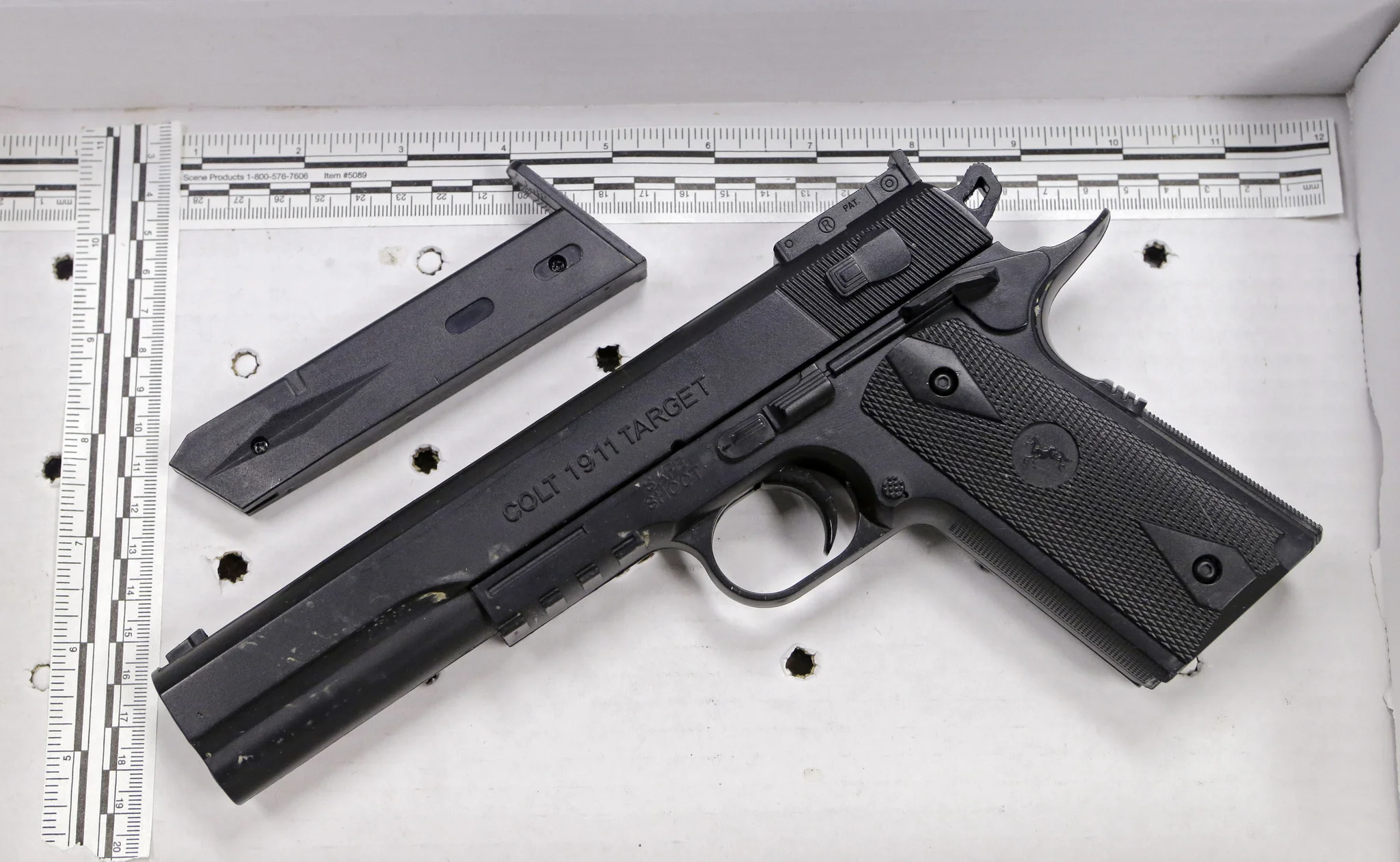 Today we are releasing Guns Don't Kill People, a new sculpture featuring a Colt 1911 Target airsoft gun with an orange cap, orange velveteen background, white wooden frame, and glass.
